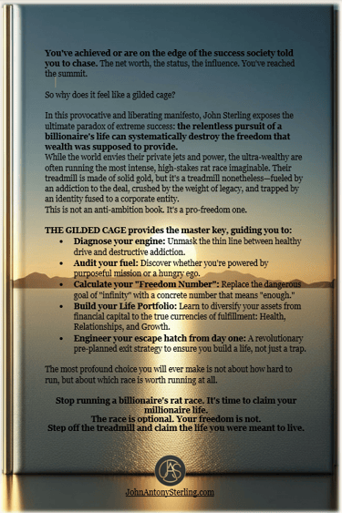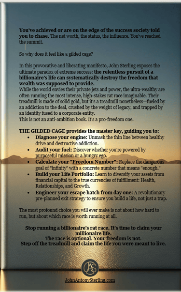 Standing atop the summit of his success, he recognized the early bars of a GILDED CAGE—the seductive, high-stakes rat race where the pursuit of endless scale and legacy systematically annihilates the very freedom wealth is meant to provide. He saw that the treadmill was just as real, even if it was now plated in gold.